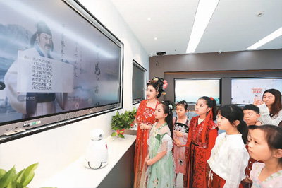 7月19日,在安徽省淮北市圖書館AI智能廳,孩子們正在與“詩仙李白”進(jìn)行互動。李 鑫攝(人民視覺)