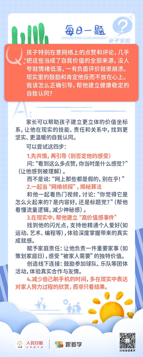 | 每日一題丨孩子過度依賴網(wǎng)絡(luò)點贊、評論來獲得自我認(rèn)同,家長該如何正確引導(dǎo)? |