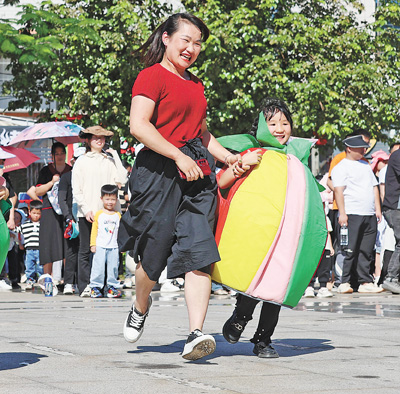 福建泉州安溪縣第十四幼兒園,家長(zhǎng)與孩子參加親子體育活動(dòng)。豐曉飛攝(人民視覺)