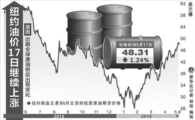 近期,國際原油價格屢現(xiàn)攀升,逼近每桶50美元。5月17日,截至當日收盤,紐約商品交易所6月交貨的輕質(zhì)原油期貨價格上漲0.59美元,收于每桶48.31美元,漲幅為1.24%。7月交貨的倫敦布倫特原油期貨價格上漲0.31美元,收于每桶49.28美元,漲幅為0.63%。分析認為,一些突發(fā)因素導致了近期油價攀升,國際油市實現(xiàn)供需平衡仍需時日。