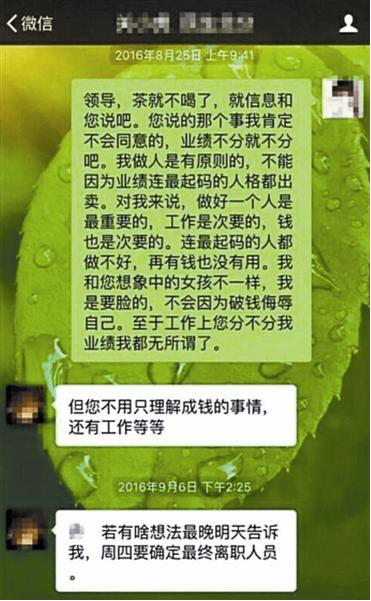 微信中還顯示,關某某在微信中多次以談“業(yè)績”為由,約女員工“出來見面聊聊”。對于如此扭曲的上下級關系,有評論稱,本是靠能力吃飯的行當,最后將“業(yè)績籌碼”演繹成“陪睡游戲”。除了反胃和憤怒,更多的是對這個時代的拷問。