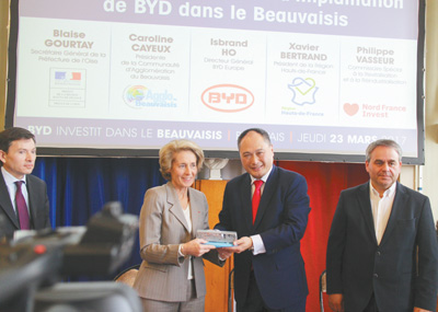 本報(bào)法國(guó)博韋3月23日電 (記者曹鵬程、殷新宇、李鶴)中國(guó)企業(yè)比亞迪23日在此間宣布,向法國(guó)上法蘭西大區(qū)投資1000萬歐元,成立電動(dòng)汽車組裝廠。比亞迪歐洲區(qū)總經(jīng)理何一鵬、上法蘭西大區(qū)議會(huì)主席格扎維埃·貝特朗、博韋市市長(zhǎng)卡洛琳娜·卡耶出席了新聞發(fā)布會(huì)。