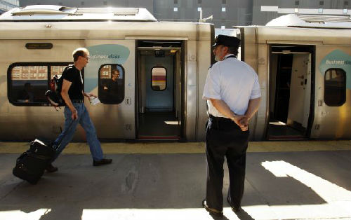 在美國(guó)波士頓市的一個(gè)火車(chē)站,乘客準(zhǔn)備登上Acela列車(chē)。(新華社)