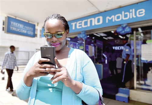 在肯尼亞首都內(nèi)羅畢市中心,一名女子在一家傳音手機(jī)專賣店前使用自己的傳音手機(jī)。10年間,來自中國深圳的傳音手機(jī)在非洲年銷售量從不到100萬臺(tái)增至近8000萬臺(tái),榮登國產(chǎn)手機(jī)海外銷量榜首,旗下社交聊天軟件注冊(cè)用戶過億。 (新華社發(fā))