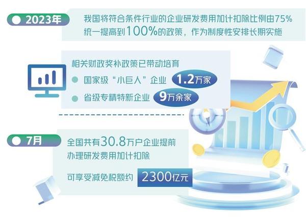 “為切實(shí)保證這一新的惠企政策落實(shí)到位,稅務(wù)部門依托稅收大數(shù)據(jù)篩選符合條件的企業(yè),定向開展政策精準(zhǔn)推送和宣傳輔導(dǎo),確保企業(yè)‘知曉政策’;會同科技部門及時(shí)發(fā)布《研發(fā)費(fèi)用加計(jì)扣除政策執(zhí)行指引2.0》,細(xì)化政策口徑,確保企業(yè)‘會用政策’;第一時(shí)間優(yōu)化升級征管系統(tǒng),改進(jìn)電子稅務(wù)局功能,讓納稅人‘足不出戶’即可快捷辦理,確保企業(yè)‘用好政策’?!眹叶悇?wù)總局新聞發(fā)言人、辦公廳主任黃運(yùn)介紹。從7月份政策落實(shí)情況看,全國共有30.8萬戶企業(yè)提前辦理研發(fā)費(fèi)用加計(jì)扣除,可享受減免稅額約2300億元。