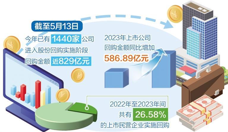 A股上市公司股份回購熱持續(xù)升溫。Wind數(shù)據(jù)顯示,截至5月13日,今年已有1440家公司進(jìn)入股份回購實(shí)施階段,合計(jì)回購金額近829億元,遠(yuǎn)超去年同期的247億元。中國上市公司協(xié)會數(shù)據(jù)顯示,2023年上市公司回購金額同比增加586.89億元,增長108.82%。