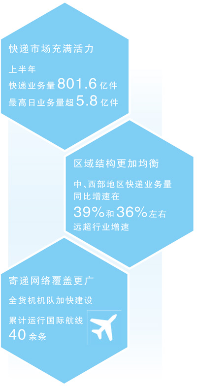 看發(fā)展動力,上半年,快遞市場充滿活力、運行良好,最高日業(yè)務(wù)量超5.8億件。