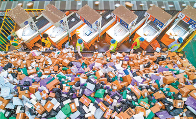 圖為江蘇省宿遷經(jīng)濟技術(shù)開發(fā)區(qū)郵政郵件處理中心,工作人員在進行分揀。
