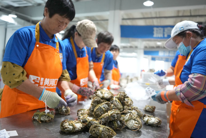 山東省東營(yíng)市墾利區(qū)的一處大閘蟹加工車(chē)間的工作人員對(duì)新鮮的大閘蟹進(jìn)行分選和捆扎(2024年9月10日攝)。新華社記者 徐速繪 攝