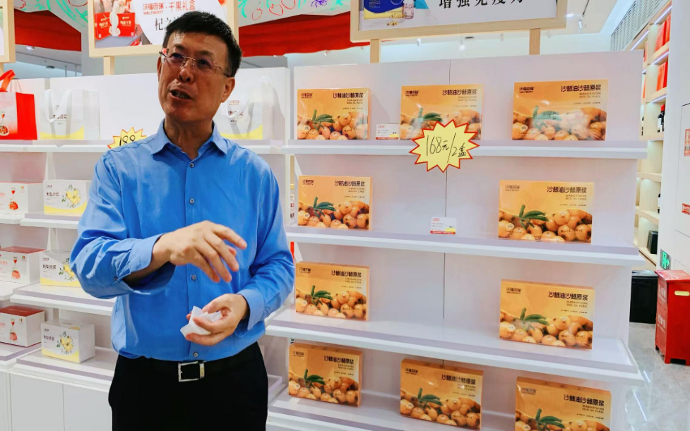 國家林業(yè)重點龍頭企業(yè)寧夏沃福百瑞公司產品間展示柜上擺放的沙棘油、沙棘原漿。新華網郭香玉攝