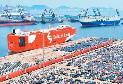 8月6日,在山東港口煙臺港,滾裝船在裝運外貿(mào)車輛(無人機照片)。唐 克攝(新華社發(fā))