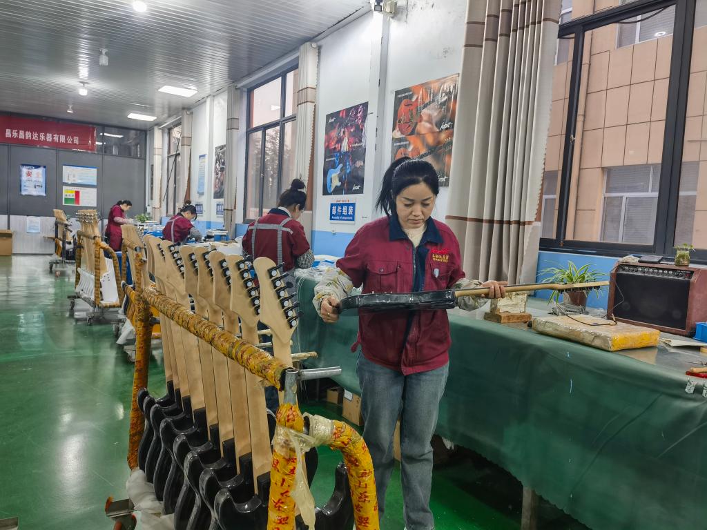 濰坊大唐樂器發(fā)展有限公司生產(chǎn)的個性化定制電吉他受到海外市場歡迎。新華社記者 王志 攝