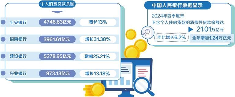 2024年,上市銀行零售業(yè)務(wù)普遍進(jìn)入調(diào)整期,消費(fèi)貸業(yè)務(wù)增長(zhǎng)強(qiáng)勁。在擴(kuò)內(nèi)需、促消費(fèi)的背景下,消費(fèi)貸成為零售業(yè)務(wù)的新增長(zhǎng)點(diǎn)。中國(guó)人民銀行數(shù)據(jù)顯示,2024年四季度末,不含個(gè)人住房貸款的消費(fèi)性貸款余額達(dá)21.01萬(wàn)億元,同比增長(zhǎng)6.2%,全年增加1.24萬(wàn)億元。多家銀行在2024年年報(bào)中披露的個(gè)人消費(fèi)貸款數(shù)據(jù)有明顯增長(zhǎng)。其中,平安銀行個(gè)人消費(fèi)貸款余額4746.63億元,同比增長(zhǎng)13%;招商銀行個(gè)人消費(fèi)貸款余額3961.61億元,較上年末增長(zhǎng)31.38%;中國(guó)農(nóng)業(yè)銀行含信用卡在內(nèi)的個(gè)人消費(fèi)貸款余額1.3萬(wàn)億元,新增2943億元,增速28.3%;中國(guó)建設(shè)銀行境內(nèi)個(gè)人消費(fèi)貸款余額5278.95億元,增幅25.21%;興業(yè)銀行個(gè)人消費(fèi)貸款余額973.13億元,較上年末增長(zhǎng)13.18%。南開(kāi)大學(xué)金融學(xué)教授田利輝表示,隨著國(guó)家提振消費(fèi)政策的出臺(tái),銀行零售業(yè)務(wù)有望逐步提速。消費(fèi)貸業(yè)務(wù)有望在政策支持下繼續(xù)增長(zhǎng),成為銀行重要的利潤(rùn)來(lái)源。