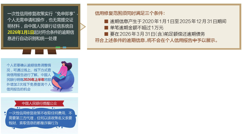 卸下“包袱”!個(gè)人信用修復(fù)助力輕裝前行 中國(guó)人民銀行22日發(fā)布一次性信用修復(fù)政策,符合相關(guān)條件的逾期信息,將不會(huì)在個(gè)人信用報(bào)告中予以展示,助力個(gè)人高效便捷重塑信用,卸下“包袱”輕裝前行。 自2006年正式上線(xiàn),全國(guó)集中統(tǒng)一的企業(yè)和個(gè)人征信系統(tǒng)已成為我國(guó)重要的金融基礎(chǔ)設(shè)施。截至11月末,征信系統(tǒng)已采集11.6億自然人的信息,其中8.1億人有信貸記錄,年度累計(jì)查詢(xún)量達(dá)65.8億次。目前個(gè)人信用報(bào)告會(huì)展示最近5年的逾期記錄,自逾期欠款還清之日起超過(guò)5年的逾期記錄不再展示。 “過(guò)去幾年,受新冠疫情等不可抗力影響,一些個(gè)人發(fā)生了債務(wù)逾期,雖然事后全額償還,但相關(guān)信用記錄仍持續(xù)影響其經(jīng)濟(jì)生活。”中國(guó)人民銀行行長(zhǎng)潘功勝在今年10月表示,為幫助個(gè)人加快修復(fù)信用記錄,同時(shí)發(fā)揮違約信用記錄的約束效力,中國(guó)人民銀行將研究實(shí)施一次性信用修復(fù)政策。 在進(jìn)行必要的技術(shù)準(zhǔn)備后,中國(guó)人民銀行于22日明確發(fā)布一次性信用修復(fù)政策有關(guān)安排。自2026年1月1日起征信中心將根據(jù)不同還款情形完成自動(dòng)調(diào)整,相關(guān)逾期記錄不再在個(gè)人信用報(bào)告中展示。 此次修復(fù)個(gè)人信用的政策,從多個(gè)方面展現(xiàn)出“誠(chéng)意滿(mǎn)滿(mǎn)”的政策溫度。 從便捷性來(lái)看,政策突出“免申即享”的特點(diǎn),個(gè)人無(wú)需跑網(wǎng)點(diǎn)、填材料,由中國(guó)人民銀行征信系統(tǒng)對(duì)符合條件的逾期信息進(jìn)行自動(dòng)識(shí)別和統(tǒng)一處理,讓修復(fù)更高效。 從靈活性來(lái)看,信用修復(fù)政策設(shè)置了3個(gè)月寬限期。個(gè)人逾期債務(wù)結(jié)清時(shí)間的最后時(shí)限是2026年3月31日,這一方面有利于政策觸達(dá)更多人群,另一方面也為個(gè)人籌措資金、安排還款留出充足時(shí)間。 “一次性”的政策安排,體現(xiàn)出“失信必懲”的剛性約束。此次政策明確剛性底線(xiàn):尚未結(jié)清欠款的,不會(huì)被納入修復(fù)范圍。這種不縱容失信的約束性,維護(hù)了信用體系公平公正的基礎(chǔ)。 業(yè)內(nèi)人士表示,“一次性”的政策安排沒(méi)有弱化信用約束,而是通過(guò)精準(zhǔn)施策,讓信用體系既有“牙齒”又有“溫度”。卸下“包袱”,輕裝上陣。隨著個(gè)人信用被及時(shí)修復(fù),信用基石將更加穩(wěn)固,為個(gè)人發(fā)展提供更好支撐。 文圖均據(jù)新華社 (責(zé)任編輯:梁艷) |