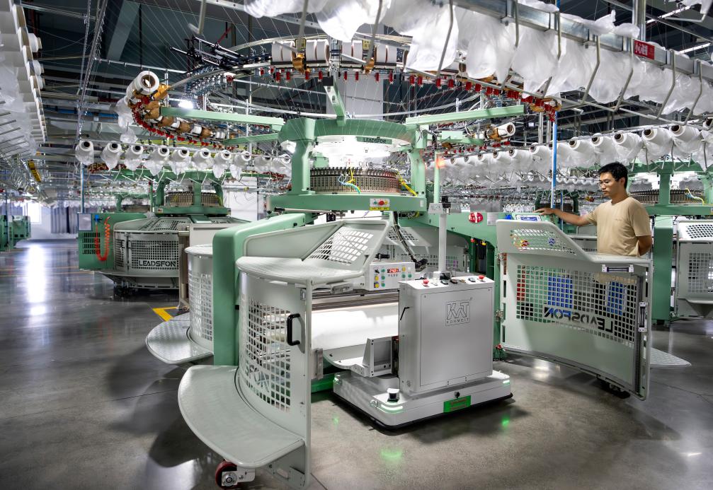 7月24日,一名工人在泉州聯(lián)興發(fā)針織織造有限公司的萊卡+5G智能數(shù)字化生產(chǎn)車間操控機器人工作。新華社記者 魏培全 攝??