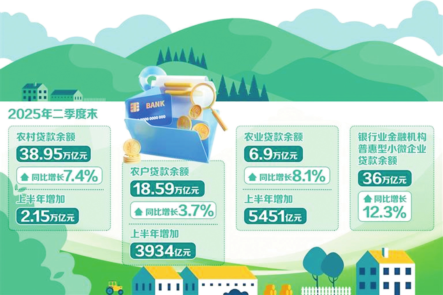 總的來看,今年二季度涉農金融投放增量擴面。2025年二季度金融機構貸款投向統(tǒng)計報告顯示,2025年二季度末,農村貸款余額38.95萬億元,同比增長7.4%,上半年增加2.15萬億元。農戶貸款余額18.59萬億元,同比增長3.7%,上半年增加3934億元。農業(yè)貸款余額6.9萬億元,同比增長8.1%,上半年增加5451億元。