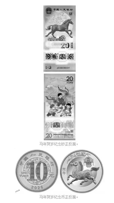 本次發(fā)行的2026年賀歲紀念幣面額10元,直徑27毫米,材質為雙色銅合金材質,發(fā)行數(shù)量1億枚,正面為面額和年份,背面以剪紙風格馬形象為主,輔以花燈和萱草圖案,壁面左側刊“丙午”字樣。紀念鈔面額20元,票面長145毫米,寬70毫米,采用塑料材質,發(fā)行量1億張,正面為馬造型主景,背面描繪兒童歡慶鑼鼓場景,同時融合傳統(tǒng)裝飾和多民族文字元素。二者均為我國法定貨幣,每人預約、兌換限額均為20張(枚)。