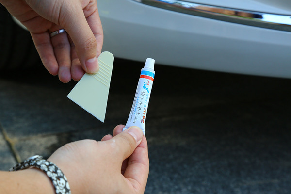 可以看到這輛車的劃痕傷至底漆了,為了更好的固漆,我們需要進(jìn)行簡(jiǎn)單的補(bǔ)土或者叫打膩?zhàn)?,?duì)凹凸不平之處也可以很好的找平。這種小管的補(bǔ)土很便宜,電商賣10元左右,而全套的補(bǔ)漆工具不足百元。