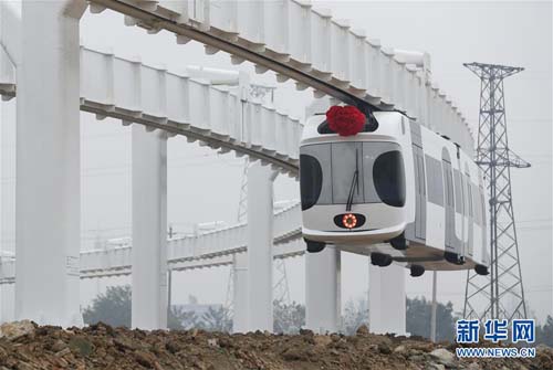 11月21日,在四川成都雙流西南航空港經濟開發(fā)區(qū),附近群眾觀看在試驗線上運行的新能源“空鐵”。當日,由中唐空鐵聯合多家單位研制的新能源懸掛式空中軌道交通試驗線,經過近兩個月的試驗與調試運行,各項指標達到設計要求。下一步將對新能源“空鐵”進行全面系統(tǒng)的運營測試,進而為制定相關技術標準和示范線建設奠定基礎。新華社記者 江宏景 攝