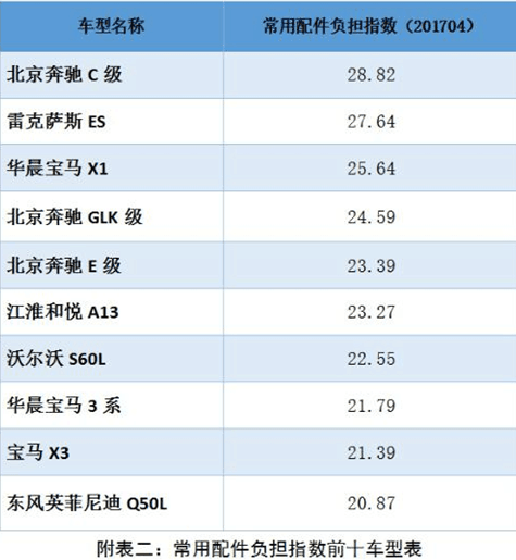 常用配件負(fù)擔(dān)指數(shù)方面,在汽車零整比系數(shù)基礎(chǔ)上,挖掘事故車維修數(shù)據(jù),選取配件損失率大于 1%的常用配件進行研究,導(dǎo)入計算公式核算各車型的常用配件負(fù)擔(dān)指數(shù)。在樣本車型中最高的車型為北京奔馳 C級,常用配件負(fù)擔(dān)指數(shù)為 28.82;最低的車型為哈弗 H6,常用配件負(fù)擔(dān)指數(shù)為 9.32。
