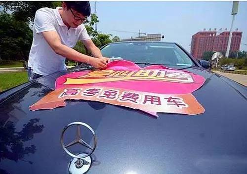瑪莎拉蒂、路虎、奔馳、寶馬……等十輛豪車在路邊一字排開,每輛車的發(fā)動機(jī)蓋上都貼著“高考免費用車”的標(biāo)語,盡管低調(diào)但車隊還是吸引了眾人的目光。