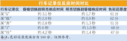 此次測試,車天下君準備一個“黑盒子”,里面放置一個屏幕常亮的智能手機。在“黑盒子”外面,放置另外一個屏幕常亮的智能手機。切換時間控制在0.3秒之內(nèi),分為“明到暗”和“暗到明”兩個環(huán)節(jié),記錄行車記錄儀場景切換時的響應時間。由測試結(jié)果一覽表可以看到,參與測試5個型號的行車記錄儀的響應時間都不盡相同:短則1秒,長則6秒。車天下君歸納如下,質(zhì)量合格的行車記錄儀從昏暗切換到明亮環(huán)境的響應時間應在3~4秒之間,從明亮切換到昏暗環(huán)境當中的響應時間應該在1~2秒之內(nèi)。