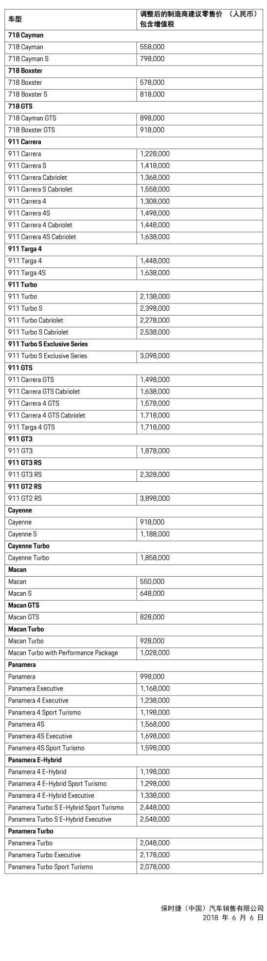 保時捷中國宣布,自2018年6月6日起,在中國大陸地區(qū)銷售的全系車型將執(zhí)行新的制造商建議零售價,希望能夠使消費者以更優(yōu)化的價格打造更個性化的跑車,提升用車體驗。具體調(diào)價方案請參考如下表格。保時捷官方網(wǎng)站上各車型的制造商建議零售價將稍后做出調(diào)整。