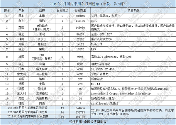 根據國家市場監(jiān)督管理總局缺陷產品管理中心1月份發(fā)布的召回公告,經濟日報-中國經濟網汽車頻道經過匯總、統(tǒng)計,整理出“2019年1月國內乘用車召回榜單”。1月,國內乘用車市場發(fā)布19起召回公告,共涉及19個品牌的644636輛汽車,同比增長93.12%,環(huán)比增長33.81%。