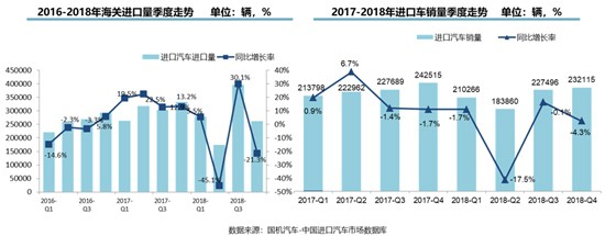 具體來看,2018年,進(jìn)口車市場供給端,海關(guān)進(jìn)口量為110.8萬輛,同比下滑8.8%;市場需求端,全年經(jīng)銷商交付客戶進(jìn)口車的數(shù)量為85.4萬輛,同比下滑5.6%。其中,2018年進(jìn)口車市場在第二、三、四季度都出現(xiàn)了巨大波動,而進(jìn)口商品關(guān)稅下降、中美貿(mào)易摩擦等因素是主因。受關(guān)稅稅率影響,二季度海關(guān)進(jìn)口量下滑45.1%,三季度,海關(guān)進(jìn)口量又恢復(fù)性增長30.1%,四季度再次出現(xiàn)大幅下滑,下滑幅度為21.3%;終端銷量走勢與之相似,二季度銷量下滑17.5%,三季度弱勢復(fù)蘇,四季度降幅擴(kuò)大至4.3%。