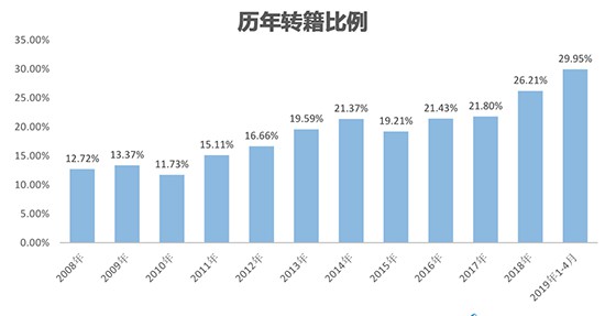 4月全國二手車市場交易量為120.06萬輛,環(huán)比下降4%,同比增長4.29%;1-4月,二手車累計銷售445.63萬輛,同比增長2.61%,跨城市交易額比例達到29.95%。羅磊表示,隨著全國各區(qū)域二手車流通的壁壘逐步消除,二手車全國自由流通越來越快捷,這一利好因素促使國內二手車交易轉籍比例在過去10年里呈逐年上升趨勢。