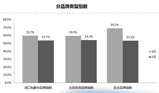 從數據上看,5月北區(qū)庫存預警指數為54.7%,東區(qū)指數為49.4%,南區(qū)指數58%,西區(qū)指數56.9%。分品牌來看,5月進口&豪華品牌指數、合資品牌指數、自主品牌指數較上月下降;另由于部分省市7月1日提前實施國六標準,5月經銷商加大了對國五車清庫力度,總體庫存水平有所下降。