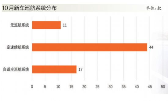 自適應(yīng)巡航系統(tǒng)在緩解疲勞和保障安全上有明顯優(yōu)勢,在10月上市車型中,搭載該系統(tǒng)的新車有17款,如新款東風(fēng)日產(chǎn)天籟、一汽豐田榮放、長安CS35、WEY VV5、吉利遠景X6以及理想ONE等車型,均搭載有自適應(yīng)巡航系統(tǒng),甚至是全速自適應(yīng)巡航系統(tǒng)。與以往相比,自適應(yīng)巡航技術(shù)的滲透率有所提升,而定速巡航的應(yīng)用則更為廣泛,在各級別車型中均有分布。10月,搭載定速巡航的新車總數(shù)為44款,而不搭載任何巡航系統(tǒng)的車型共有11款,主要體現(xiàn)在定位較低車型上。