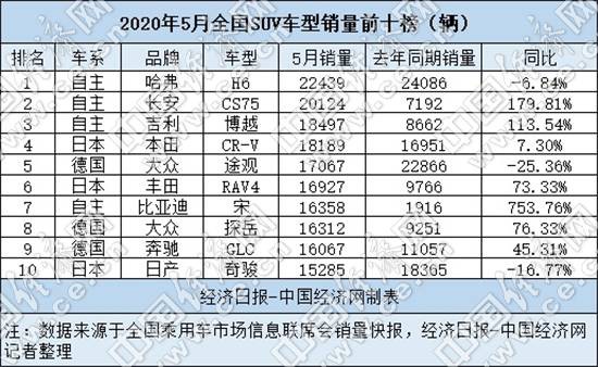 具體來看,5月,共有4款自主車型入榜銷量前十,“自主三強”哈弗H6、長安CS75和吉利博越依然包攬前三甲。