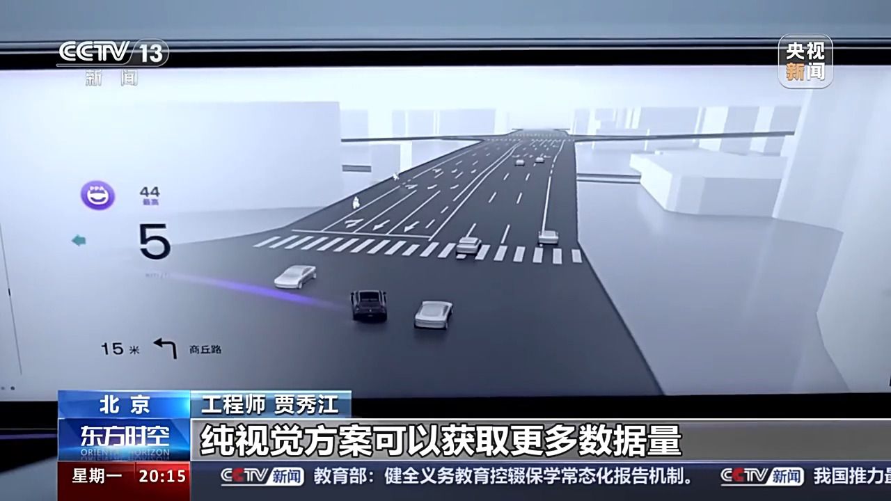 總臺央視記者 張叢婧:這里能夠看出每輛車的大小還有位置以及它們的行駛方向,這個綠色的是綠化帶,藍(lán)色的是隔離帶。它能夠識別的外部世界是非常具體化的。
