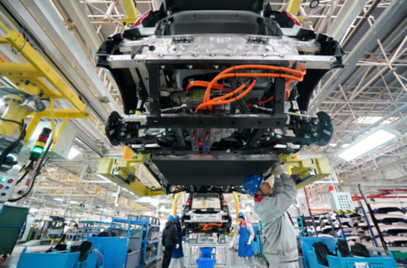奇瑞新能源汽車股份有限公司石家莊分公司的工人在總裝車間生產(chǎn)線上工作(資料圖片 新華社記者 牟宇 攝)