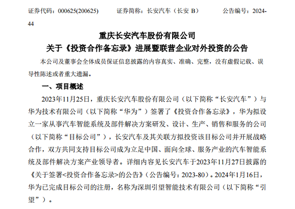 2023年11月25日,長安汽車與華為簽署《投資合作備忘錄》。華為擬設(shè)立一家從事汽車智能系統(tǒng)及部件解決方案研發(fā)、設(shè)計、生產(chǎn)、銷售和服務(wù)的公司,雙方共同支持目標(biāo)公司成為立足中國、面向全球、服務(wù)產(chǎn)業(yè)的汽車智能系統(tǒng)及部件解決方案產(chǎn)業(yè)領(lǐng)導(dǎo)者。