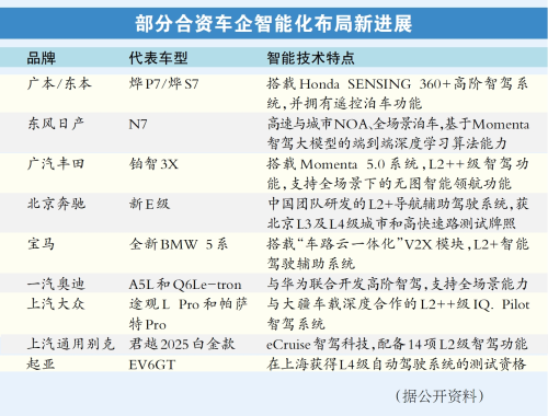 在業(yè)內(nèi)人士看來(lái),這并非偶然。從時(shí)間軸上看,在經(jīng)歷了多年“上車(chē)?yán)щy”、研發(fā)成本高等轉(zhuǎn)型陣痛后,合資車(chē)企通過(guò)加快步伐,與本土科技企業(yè)合作,開(kāi)始在高階智能駕駛領(lǐng)域迎頭趕上,縮小與自主品牌的差距。“從電動(dòng)車(chē)到燃油車(chē),從智駕系統(tǒng)到‘大彩電’,合資車(chē)企的智電轉(zhuǎn)型正在提速?!?/p>