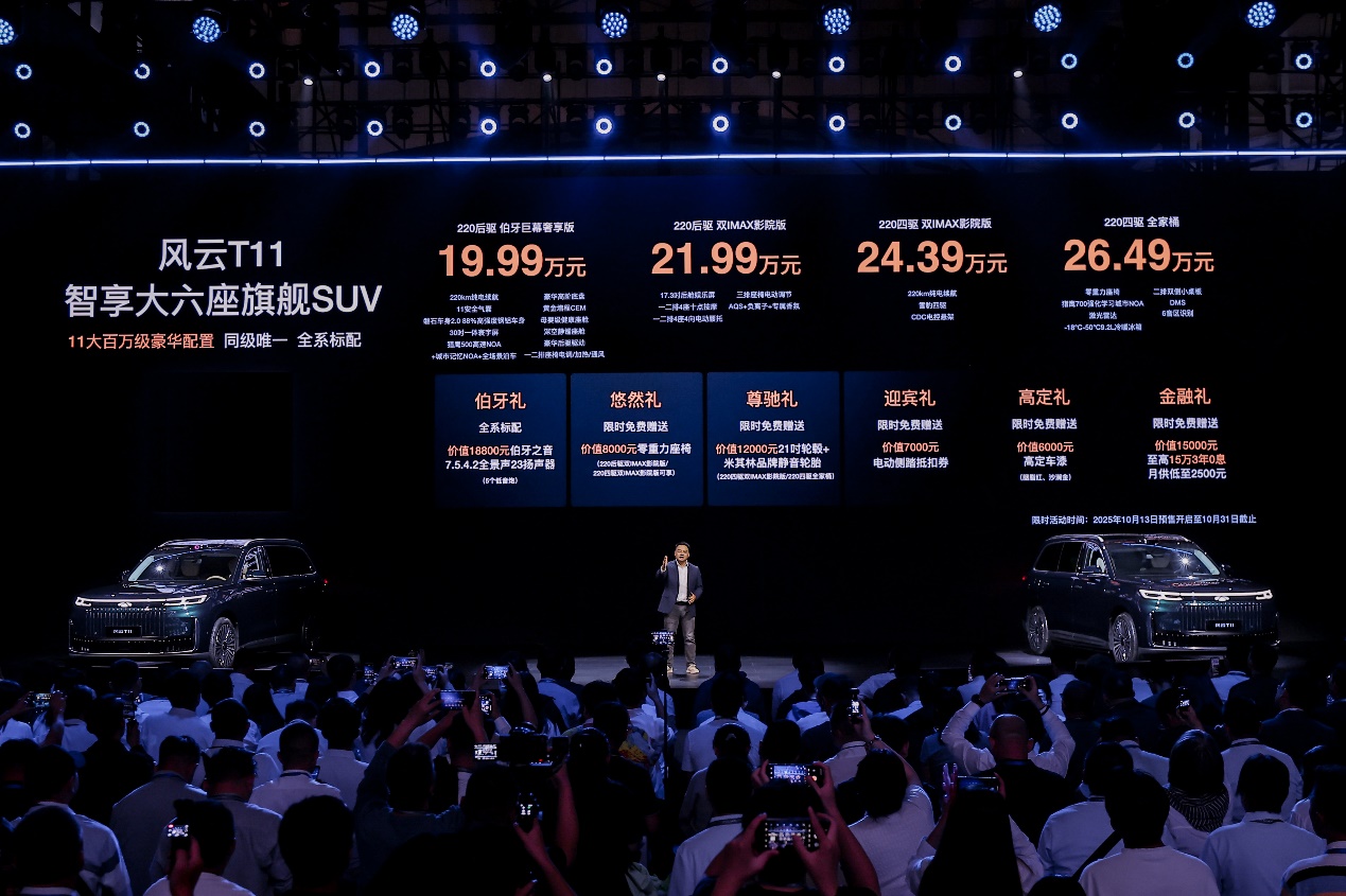 風(fēng)云T11已正式開啟預(yù)售,共推出4款版型,其中220后驅(qū)伯牙巨幕奢享版預(yù)售價19.99萬元;220后驅(qū)雙IMAX影院版預(yù)售價21.99萬元;220四驅(qū)雙IMAX影院版預(yù)售價24.39萬元;220四驅(qū)全家桶預(yù)售價26.49萬元。同時,發(fā)布會現(xiàn)場公布了以下多重極具誠意的預(yù)售權(quán)益。