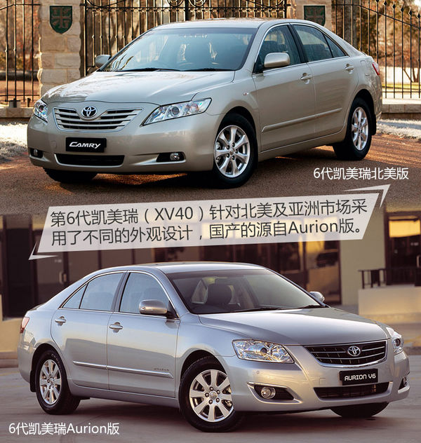 第6代凱美瑞(XV40)誕生于2006年,6月17日正式上市,由廣汽豐田進(jìn)行本土化生產(chǎn)。雖然是豐田的全球化車型,但是XV40針對(duì)北美及亞洲市場采用了不同的外觀設(shè)計(jì)。北美版的車燈更加“鋒利”更加年輕運(yùn)動(dòng),而國產(chǎn)的凱美瑞則采用了更加符合東方審美的亞洲版造型,又被稱作Prestige版或Aurion版。
