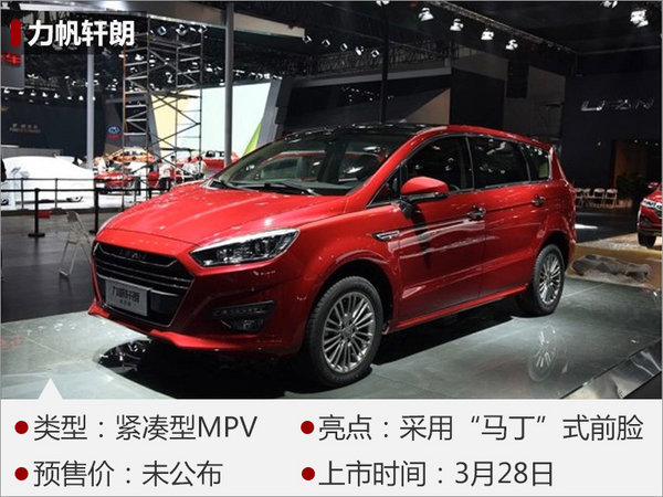 在2016年11月舉行的廣州國際車展上,力帆汽車對外發(fā)布了全新MPV—軒朗,其“馬丁”式前臉設(shè)計令人印象深刻,同時運動化輪圈與下沉式車頂?shù)拇钆湟彩窍嗟靡嬲?。?nèi)飾方面,力帆軒朗以黑色為主,中控臺下方按鍵布局較為簡潔,實用性較高。力帆軒朗搭載了1.5L渦輪增壓和2.0L自然吸氣兩款發(fā)動機,前者匹配的是8速自動變速箱或5速手動變速箱,后者則匹配的是5MT或CVT變速箱。新車將于3月28日正式上市。