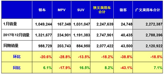 乘聯(lián)會數(shù)據(jù)顯示,1月SUV共銷售1031047輛,同比增長16.5%,環(huán)比下降13.5%。崔東樹認為,1月SUV有如此增速,說明其處于良好的發(fā)展狀態(tài),這說明在去年12月到今年1月小排量購置稅政策變化的過程中,SUV所受影響較小。