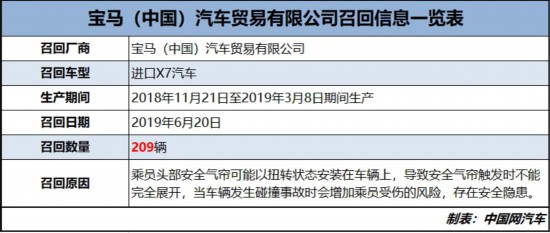 6月20日下午,國家市場監(jiān)督管理總局發(fā)布消息,寶馬(中國)汽車貿易有限公司根據(jù)《缺陷汽車產品召回管理條例》和《缺陷汽車產品召回管理條例實施辦法》的要求,決定自即日起,召回2018年11月21日至2019年3月8日期間生產的部分進口X7汽車,共計209輛。