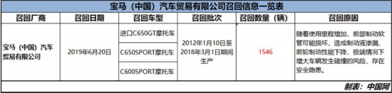 同時,寶馬(中國)汽車貿易有限公司自即日起召回2012年1月10日至2018年3月1日期間生產的進口C650GT、C650SPORT、C600SPORT摩托車,共計1546輛。