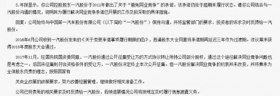 2011年6月,一汽股份成立之初,曾向一汽轎車和一汽夏利作出不可撤銷承諾:在一汽股份成立后五年內(nèi)通過資產(chǎn)重組或其他方式整合所屬的轎車整車生產(chǎn)業(yè)務(wù),以解決同業(yè)競爭問題。但五年過去了,這一問題并未得到解決,在2016年6月28日,一汽轎車和一汽夏利同時發(fā)布公告稱,一汽股份原計劃在五年內(nèi)解決其與子公司一汽轎車、一汽夏利同業(yè)競爭的承諾無法履行,將承諾期再度延遲三年作為過渡期,而上述承諾的截止日期,也就是2019年6月28日。