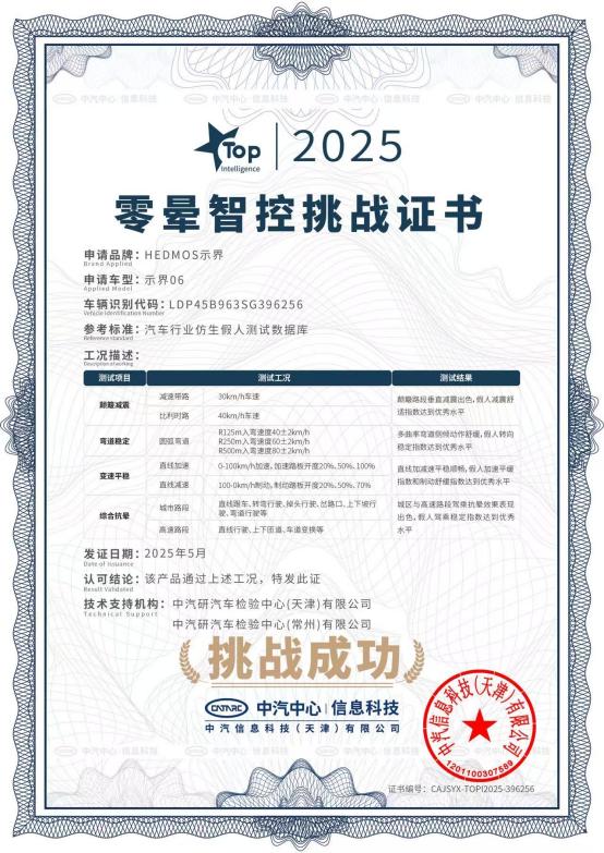 近期,在行業(yè)首次的暈動(dòng)仿生假人零暈智控挑戰(zhàn)中,示界06展現(xiàn)了優(yōu)異的駕控表現(xiàn)。中國(guó)汽車研究中心有限公司高級(jí)工程師趙博文在發(fā)布會(huì)現(xiàn)場(chǎng)公布測(cè)試數(shù)據(jù)時(shí)指出:“通過精準(zhǔn)的電機(jī)扭矩動(dòng)態(tài)分配、法系底盤調(diào)?;?,以及搭載的‘零暈智控’技術(shù)體系,示界06在六維駕控測(cè)試中表現(xiàn)出行業(yè)優(yōu)秀水平?!睖y(cè)試結(jié)果顯示,示界06完美實(shí)現(xiàn)了“6不”卓越體驗(yàn):簸路不顛、彎道不飄、加速不竄、減速不抖、駕乘不暈、長(zhǎng)途不累,為行業(yè)樹立了駕乘舒適新標(biāo)桿。