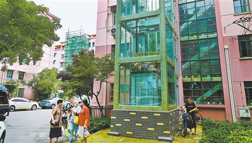 在上海市長寧區(qū)北新涇街道新涇六村,居民在加裝了電梯的12號(hào)樓旁聊天(新華社記者 方喆/攝)