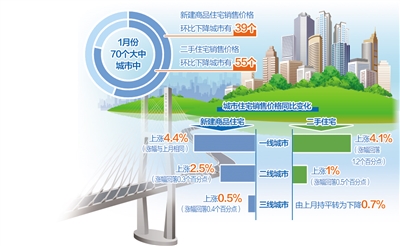 1月份,70個(gè)大中城市中,新建商品住宅和二手住宅銷售價(jià)格環(huán)比下降城市分別有39個(gè)和55個(gè),比上月分別減少11個(gè)和8個(gè)。