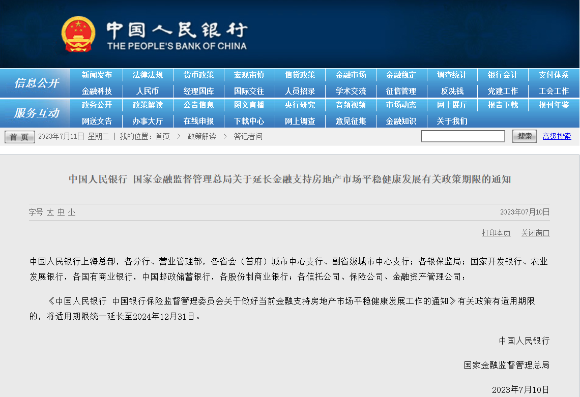 央廣網北京7月11日消息 據(jù)中國人民銀行網站消息,中國人民銀行、國家金融監(jiān)督管理總局7月10日發(fā)布通知,將去年發(fā)布的支持房地產“金融16條”部分政策,適用期限延長至2024年12月31日。