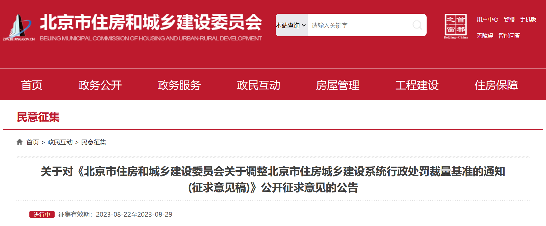 央廣網(wǎng)北京8月23日消息 據(jù)北京市住房和城鄉(xiāng)建設委員網(wǎng)站消息,為貫徹落實《建設工程質(zhì)量檢測管理辦法》《房地產(chǎn)開發(fā)企業(yè)資質(zhì)管理規(guī)定》相關(guān)處罰職權(quán),北京市住房和城鄉(xiāng)建設委員會制定了《北京市住房和城鄉(xiāng)建設委員會關(guān)于調(diào)整北京市住房城鄉(xiāng)建設系統(tǒng)行政處罰裁量基準的通知(征求意見稿)》,現(xiàn)向社會公開征求意見。公開征集意見時間為:2023年8月22日至8月29日。