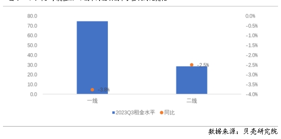 圖8 2023年三季度重點(diǎn)40城不同能級(jí)城市租金及同比變化